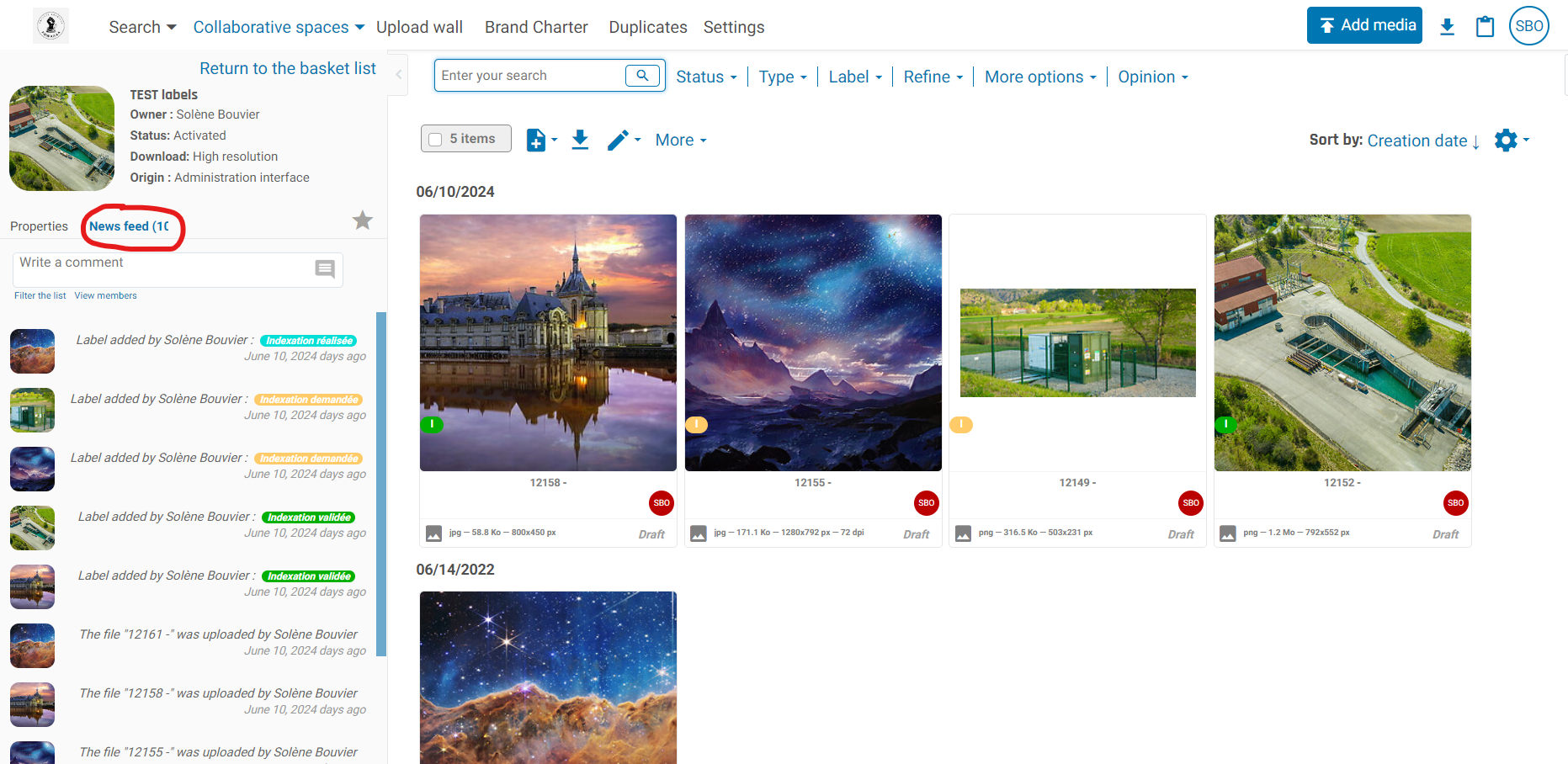 The news feed brings together all the actions and comments of a basket.