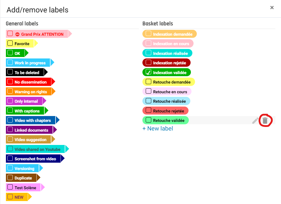 The "basket" or "workflow" labels are specific to each basket and workflow. All members can delete labels specific to the basket or workflow.