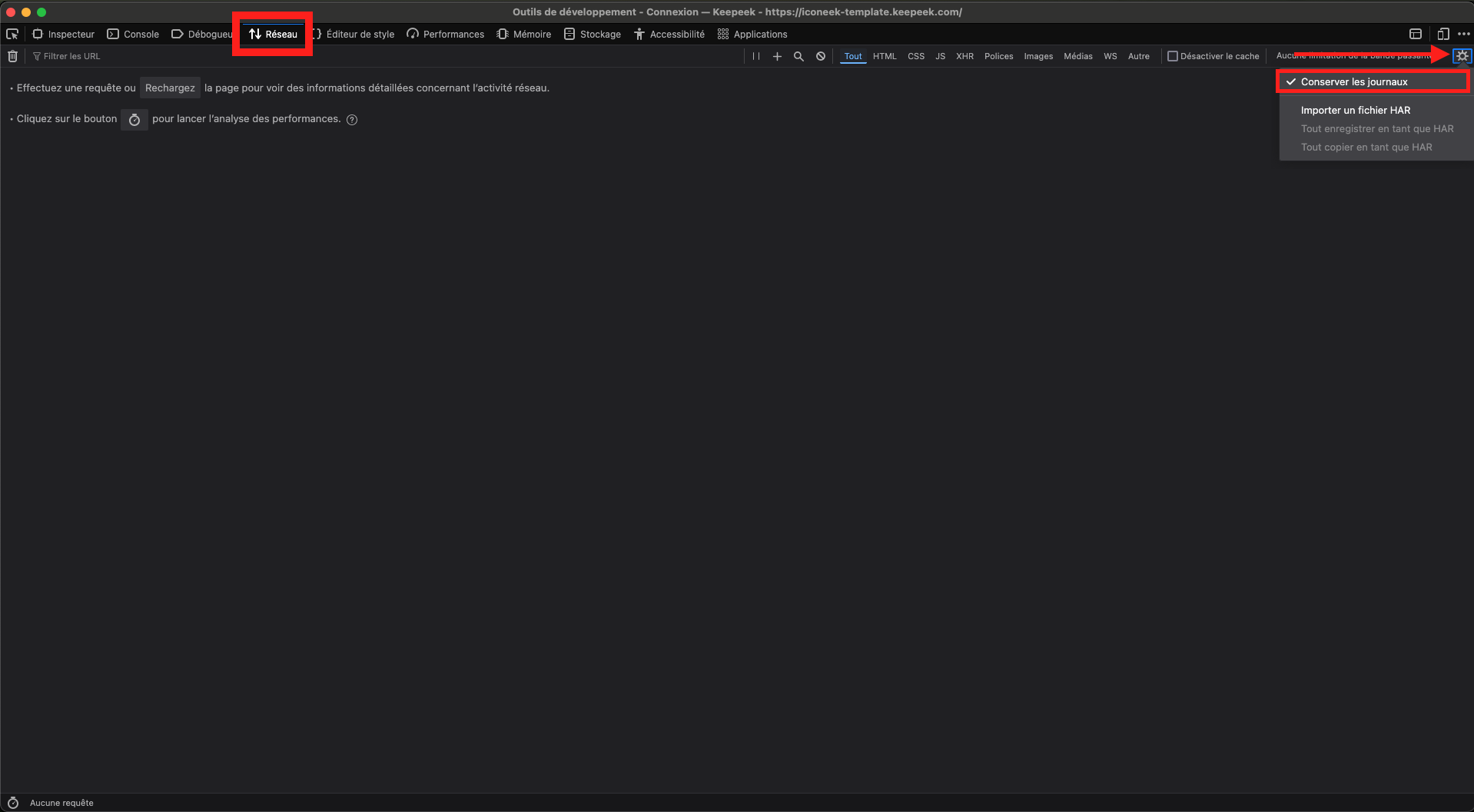 Dans l'onglet Network (Réseau), cochez la case Preserve log (Conserver les logs).